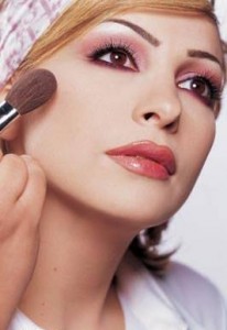 رژ گونه : به مشتری می گوییم که لبخند بزند بعد روی برجستگی گونه را به سمت شقیقه ها رژ گونه می زنیم . این در حالت بسیار عادی است ولی برای آرایش عروس بهتر است برای زدن رژ گونه ابتدا تعیین کنیم که هدف از زدن آن لاغرکردن است یا پرحجم نشان دادن که این بستگی به فرم صورت شخص دارد.به طورکلی برای برجسته کردن از رنگ های روشن و براق با تن صورتی وبرای لاغرکردن و کم حجم کردن از رنگ های مات و تیره با تن قهوه ای استفاده می کنیم.البته در پوست های برنز از رنگ های صورتی و بنفش استفاده نمی کنیم چون در صورت حالت کبودی بوجود می آید.