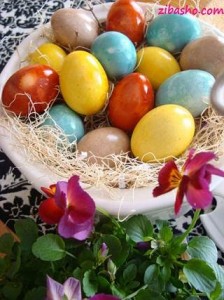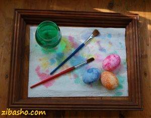 اگر با مداد شمعی، روی تخم مرغ نقاشی رسم کنید و چند ثانیه داخل رنگ بگذارید، از آن شکل زیبایی به دست می آید. ابتدا به وسیله مداد شمعی تصاویری از گل روی تخم مرغ نقاشی کنید و قسمت میانی پوسته تخم مرغ را به صورت نواری سفید بگذارید و دو سر تخم مرغ را درون رنگ بنفش روشن فرو کنید.
