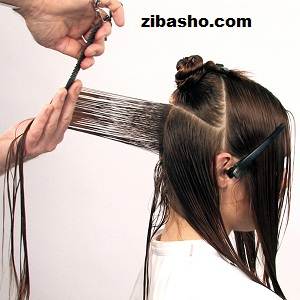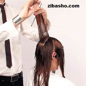 ۲-قسمتی از موها را که در تقسیم بندی ما وجود دارد را به صورت(شعاعی) عمودی گرفته و تا طول (قد)ی که دوست داریم را با زاویه ۹۰ درجه کوتاه میکنیم.این خط عمودی راهنمای ماست به همین ترتیب خط به خط به طور عمودی جلو رفته تا به پشت گوش ها رسیده و قسمت پشت مو تمام شود.