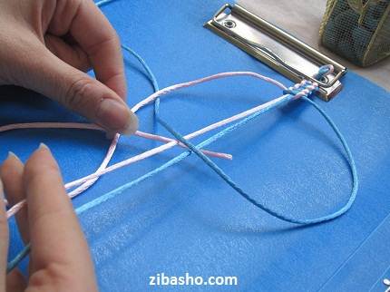 مطابق شکل نخ سمت راستی روی دوتا نخ وسط قرار میگیرد و آخرین نخ(نخ سمت چپ) را روی اولین نخ قرار دهید.