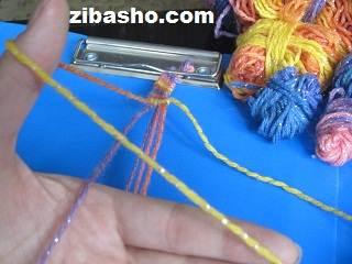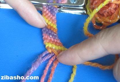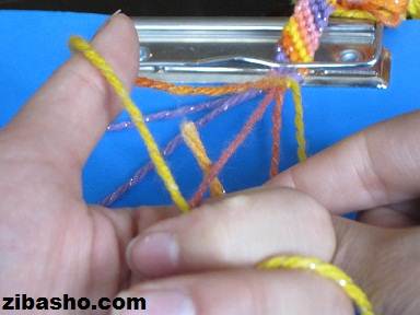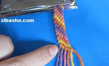 در اینجا ۶ تا نخ انتخاب کردیم بسته به سلیقه ی خودتان برای پهن تر یا نازک تر شدن آن میتوانید از ۴ نخ یا ۶نخ یا ۸ نخ یا حتی بیشتر استفاده کنید.همانطور که در عکس مشاهده می کنید از سمت چپ شروع به بافت میکنیم،اولین نخ سمت چپ که نخ نارنجی زرد هست را روی نخ کناری که بنفش رنگ هست قرار می دهیم.