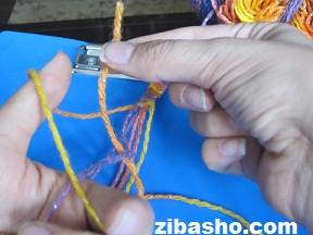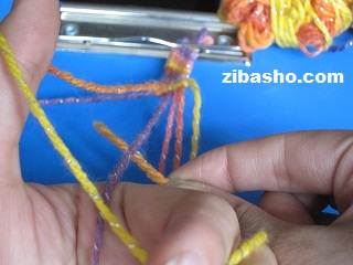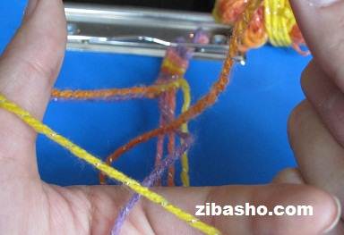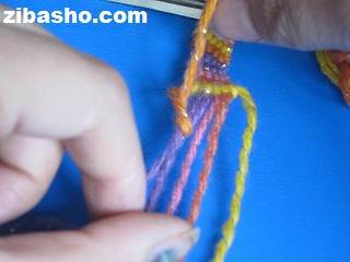 همانطور که در شکل هم مشاهده میکنید نخ اول ما که نارنجی زرد بود یک دور کامل روی تمام نخ ها گره خورد و حالا نوبت نخ بنفش است.