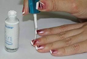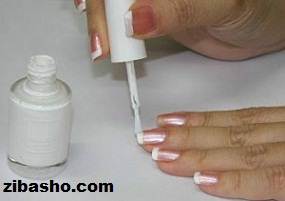 در این گام قسمت سفید و لبه ی ناخن را رنگ سفید میزنیم.