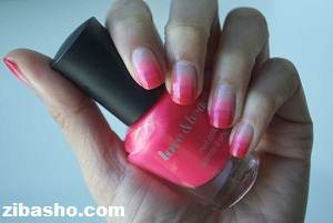 با استفاده از یک اسفنج یک سوم ریشه ناخن را رها کنید و مانند شکل به صورت کم رنگ و ملایم روی ناخن ها بکشید،سعی کنید فشار دستتان یکدست باشد.این لاک love &beauty است رنگ haute pink