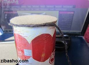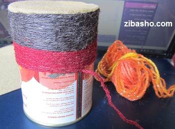 بعد از این مراحل کمی چسب چوب یا مایعی را روی قوطی بزنید و بعدا شروع کنید به دور زدن متراکم نخ ها و آنها را به قوطی می چسبانیم