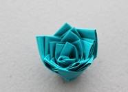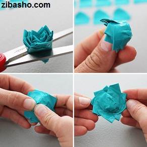 تمام قطعه ها که دور هم پیچ خوردند را از پایین یا در واقع ته گل را با قیچی میبریم تا کف فلت و صافی داشته باشیم و بعد با شست دست اون را صاف میکنیو شکل میدهیم و کاملا ته گل را با چسب آغشته می کنیم