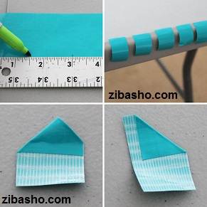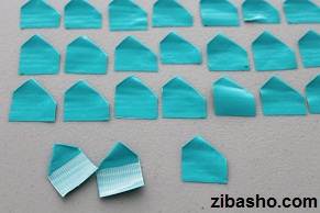 ابتدا انگشتر رزی را آموزش میدهیم از ربان فیروزه ای برای انگشتر استفاده میکنیم هر گلبرگ را ۴ سانت یا یک و نیم اینچ از ربان را با قیچی جدا میکنیم؛۲۰ عدد ۴سانتی جدا میکنیم و همونطور که در تصویر مشاهده می کنید، از طول ربان گرفته و یک بار از چپ و یک بار از راست تا میزنیم مانند تصویر بالا