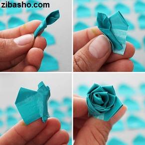 اولین مرحله برای ایجاد گل یک تکه ربان را برداشته و کاملا دور خودش میپیچانیم مانند تصویر بالا،قطعه ی دوم را کمی پایینتر به دور قطعه ی اول میپیچانیم و همینطور این سریال را ادامه میدیم تا تمام قطعه ها تمام بشوند