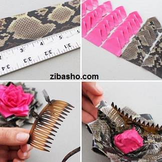 حالا برای کلیپس یا ترئین شانه به یک شانه نیاز داریم و مراحل درواقع مانند همان انگشتر انجام میشود منتها سایز ربان ها فرق میکند و دیگه ۱/۵ اینچ که برای کلیپس یا شانه به سلیقه ی خودتون ببرید باید بلند تر باشه مثلا ۱۲ سانت یا ۶ اینچ و بعد با همان قاعده ی انگشتر دور هم بپیچید و سپس با تیکه از ربان گل را به آن بچسبانید