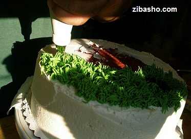 کیک اسفنجی را به شکل گرد برش داده و سپس برش های افقی بدهید لابه لای کیک را خامه فرم گرفته اضافه کنید در این مرحله می توانید از مغز گردو، موز ،آناناس و شکلات … استفاده کنید .همچنین می توانید خامه کیک را طعم بندی (طعم شکلات ، قهوه ، نسکافه…) سپس یک لایه خامه نازک روی کیک بکشید. سپس با استفاده از ماسوره چمن و خامه فرم گرفته سبز به شکل سبزه ایجاد کنید.
