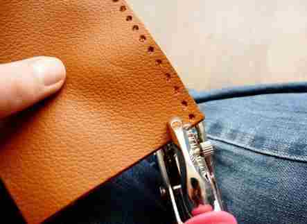دقت کنید که سایز پانچتون زیاد بزرگ نباشه ؛همانطور که در تصویر هم مشاهده میکنید دو ورق چرمی را رو هم گذاشته و بعد از سوراخ کردن نخ را یکی یکی از سوراخها رد می کنیم.